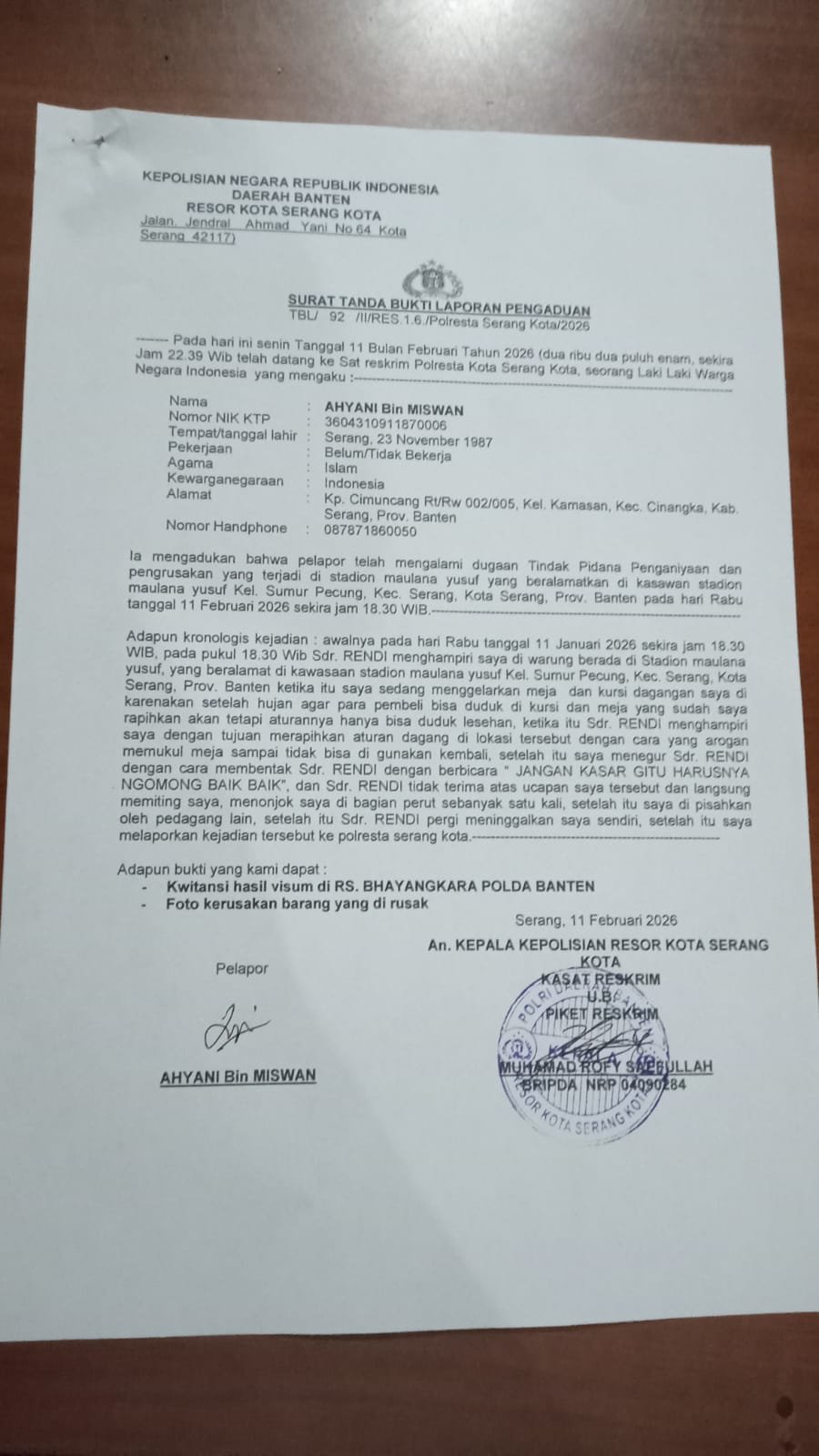 Oknum Satgas Dispora Kota Serang Dilaporkan Pemilik Kedai Di Stadion