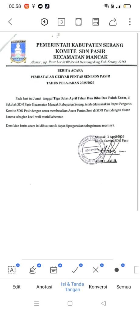 Pada hari ini Jumat tanggal Tiga Bulan April Tahun Dua Ribu Dua Puluh Enam, di Sekolah SDN Pasir Kecamatan Mancak Kabupaten Serang, telah dilaksanakan Rapat Pengurus Komite SDN Pasir dengan acara membatalkan Acara Pentas Seni di SDN Pasir, dengan alasan karena sebagian kecil wali murid keberatan