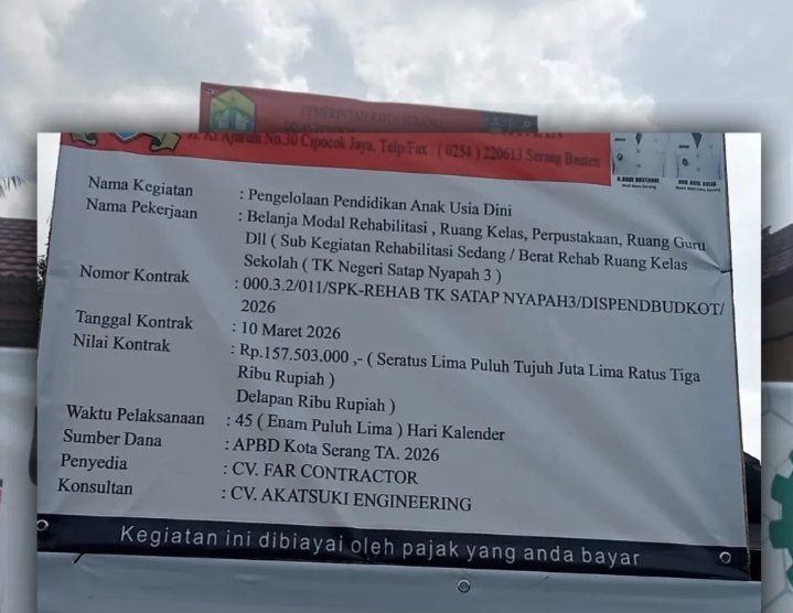 Pekerjaan Rehab tersebut bersumber dari APBD KOTA SERANG TA 2026,Nilai anggaran Rp.157.503.000,Tggl Kontra: 10 Maret 2026,Waktu Pelaksanaan:45 Hari Kalender,Penyedia Jasa : CV Far Kontraktor ,Konsultan : CV.Akatsuki Engeneering.